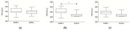 Plasma RNA concentration in SARS-CoV-2-positive (N = 13), SARS-CoV-2-negative (N = 11) and control groups (N = 8). (a) SARS-positive group vs. SARS-negative group (p ≥ 0.05). (b) SARS-positive group vs. control group (* p < 0.05). (c) SARS-negative group vs. control group (p ≥ 0.05).