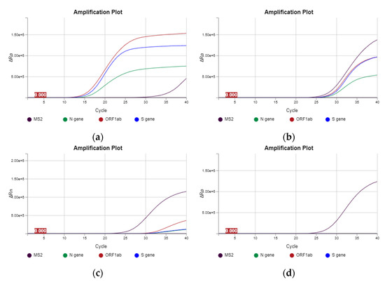 The kit used for the PCR reaction was the TaqPath COVID-19 CE-IVD RT-PCR (Life Technologies). The mastermix was prepared following the manufacturer’s instructions. Then, 15 uL of the mastermix and 10 uL of samples and controls (positive control and negative control) were loaded onto a microplate. The reaction was conducted in a QuantStudio 5 (Applied Biosystems, Waltham, MA, USA), and the results were interpreted using the COVID-19 Interpretive Software (Thermo Fisher Scientific).