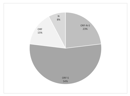 Three patients (23.08%) showed ORF, N and S gene positivity (Figure 3a,b). ORF and S gene positivity was observed in seven patients (53.85%). The ORF gene was present in two patients (15.38%) and the N gene in one (7.29%) (Figure 3c). The mean SARS-CoV-2 load was 41.106 copies/mL (range, 37.710–44.597 copies/mL). Table 3 and Figure 4 summarize the findings.