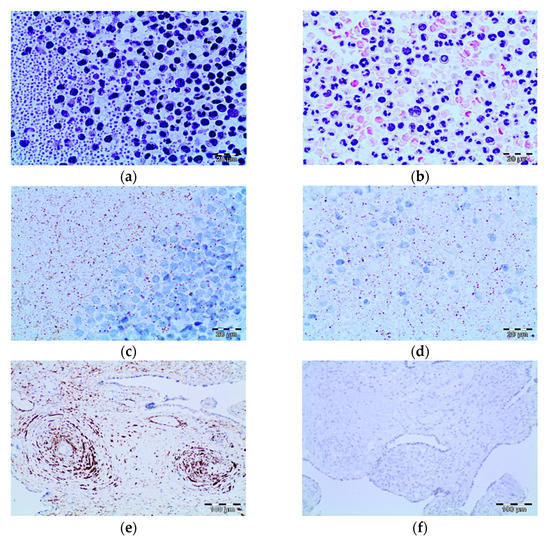 We investigated two types of antibodies to SARS-CoV-2 that were standardized in our laboratory and that immunoreact with protein S and the nucleoprotein (NP). For the two antibodies investigated, we observed granular cytoplasmic reactivity of varying intensity in occasional lymphocytes, monocytes and platelets. This immunoreactivity was observed in all cases with a positive RT-PCR result for SARS-CoV-2. Three cases with a negative RT-PCR result for SARS-CoV-2 also showed this type of cellular expression pattern (Figure 5c,d). The positive control (placenta from a patient with SARS-CoV-2 infection) showed granular cytoplasmic immunoreactivity in smooth muscle and endothelial cells. Granular reactivity was also observed in isolated stromal cells. In the negative control, no immunoreaction was found for either of the two antibodies investigated (Figure 5e).