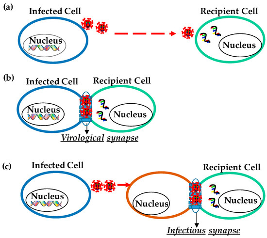 Transmission of HIV. (a) Cell-free HIV virion transmission to a distant cell. (b) Cell-to-cell transmission through specialized structures called virological synapses. (c) Trans-infection, in which virus particles are captured by a cell that itself does not get infected (orange color) and then is presented to a target cell (green color) at a cell-cell contact designated infectious synapse.