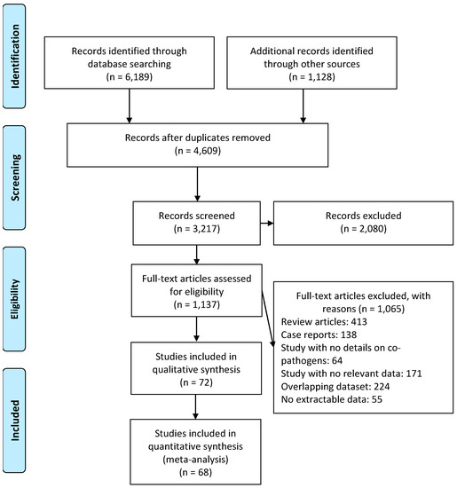 Coronavirus disease 2019 (COVID-19) is caused by the severe acute respiratory syndrome coronavirus 2 (SARS-CoV-2) and was first described in Wuhan, China in 2019. Globally, as of 15 April 2021, there have been 137,866,311 confirmed cases of COVID-19, including 2,965,707 deaths, as reported by the World Health Organization [1]. Coinfection with SARS-CoV-2 and other bacterial, fungal, and respiratory viral pathogens [2,3,4], Gram-positive and Gram-negative bacteria [5,6,7], Middle East respiratory syndrome coronavirus (MERS-CoV) [8], and influenza [9,10,11,12,13] has been described. However, the reported frequency is variable. Such coinfections in patients with SARS-CoV-2 may be a cause of increased morbidity and mortality [2,6,7,14,15,16,17,18,19,20,21,22]. Thus, timely diagnosis is important to initiate appropriate therapy and limit the overuse of antimicrobial agents. Previous studies, including case series [2,5,8,11,14,15,16,19,20,23,24,25,26,27,28,29,30,31,32,33,34,35,36,37,38,39,40,41,42,43,44,45,46,47,48,49,50], cohort studies [3,4,6,7,9,10,12,13,17,18,21,22,51,52,53,54,55,56,57,58,59,60,61,62,63,64,65,66,67,68,69,70], and meta-analyses [71,72,73], have shown variable results. In light of recent studies evaluating coinfections in SARS-CoV-2 patients, we aimed to re-evaluate the prevalence of bacterial, fungal, and respiratory viral coinfections in a comprehensive meta-analysis. Moreover, we aimed to identify the risk-factors, characteristics, and consequences associated with SARS-CoV-2 coinfection.