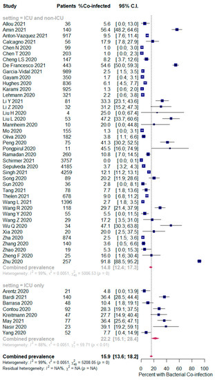 In this meta-analysis, bacterial coinfection was more prevalent than fungal and other respiratory viruses. This finding may reflect high rates of antimicrobial use for admitted patients with SARS-CoV-2 infection to treat documented or presumed bacterial co-infections. Thus, it is important to study the occurrence, type, and intended antimicrobial agent use in SARS-COV-2 patients in order to develop additional strategies for the optimal use of antimicrobial agents in this population. As expected, bacterial, fungal, and other respiratory viral co-infections in SARS-CoV-2 patients were more frequent in ICUs compared with non-ICU locations [2,20,28,57], a finding which has previously been described in systematic reviews [71,72] and may reflect the epicenter role of ICUs in both infections and antimicrobial resistance. One of the reasons for the increase in infection rate in ICUs could be due to the simultaneous infection of the virus and bacterium. Viruses can facilitate the attachment and colonization of the bacteria in the respiratory tract, which is certainly no exception for SARS-CoV-2 [86]. Nevertheless, other factors such as ICU type, used equipment rate, admission or discharge criteria, high workload or nurse ratio, etc. can also affect the quality of care and the rate of ICU-acquired, healthcare-associated infections [87,88]. With observed strains currently being placed on healthcare systems during the upstroke of the SARS-CoV-2 pandemic, guidelines must focus on the maintenance of good knowledge and compliance of infection prevention and control [89], antimicrobial stewardship [90], and robust surveillance for healthcare-associated infections and antimicrobial resistance [91,92].