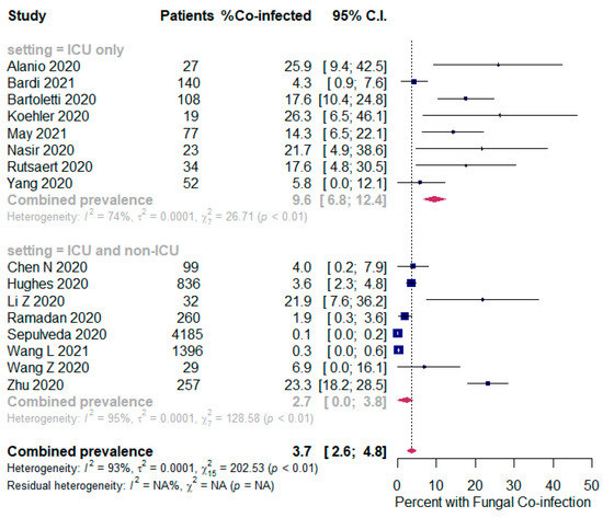 In bacterial coinfected SARS-CoV-2 patients, subgroup analysis showed some difference in the rates between all patients (ICU and non-ICU group); and the ICU only group (14.8% (95% CI 12.4 to 17.3, n = 1802, 41 studies, I2 = 99%); and 22.2% (95% CI 16.1 to 28.4, n = 137, 8 studies, I2 = 88%), respectively); Figure 2. In the fungal co-infected SARS-CoV-2 patients, subgroup analysis showed a significant difference in the rates between all patients (ICU and non-ICU); and ICU only patients [2.7% (95% CI 0.0 to 3.8, n = 155, 8 studies, I2 = 95%); and 9.6% (95% CI 6.8 to 12.4, n = 62, 8 studies, I2 = 74%), respectively]; Figure 3.