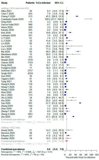 However, in the respiratory viral co-infected SARS-CoV-2 patients, subgroup analysis showed an identical proportion between all patients (ICU and non-ICU) and the ICU only patients [6.6% (95% CI 5.5 to 7.7, n = 723, 40 studies, I2 = 96%); and 6.6% (95% CI 0.0 to 11.3, n = 14, 4 studies, I2 = 58%), respectively]; Figure 4.