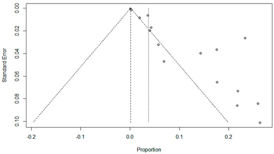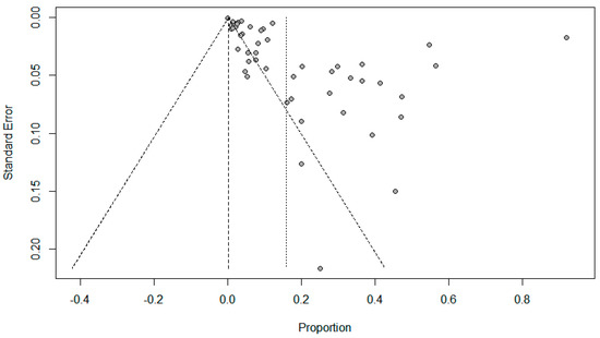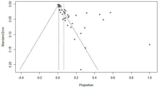 Funnel plots for possible publication bias for the pooled effect size to determine the prevalence of coinfections in SARS-Cov-2 patients appeared asymmetrical on visual inspection, and Egger’s tests confirmed asymmetry with p values < 0.05; Figure 5, Figure 6 and Figure 7.