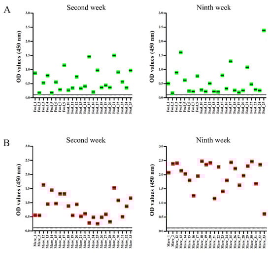 Equine herpesvirus type 4 (EHV-4) glycoprotein G (gG)-peptide based-enzyme-linked immunosorbent assay. Average optical density (OD) values of antibodies against gG of EHV-4 at the time of the outbreak [Second week] and post outbreak period [Ninth week] were determined in foals (A) and mares (B), respectively. Green dots: foals; Red dots: Mares. Continuous and dotted lines show the cut-off values for questionable and negative results for EHV-4 antibodies, respectively.