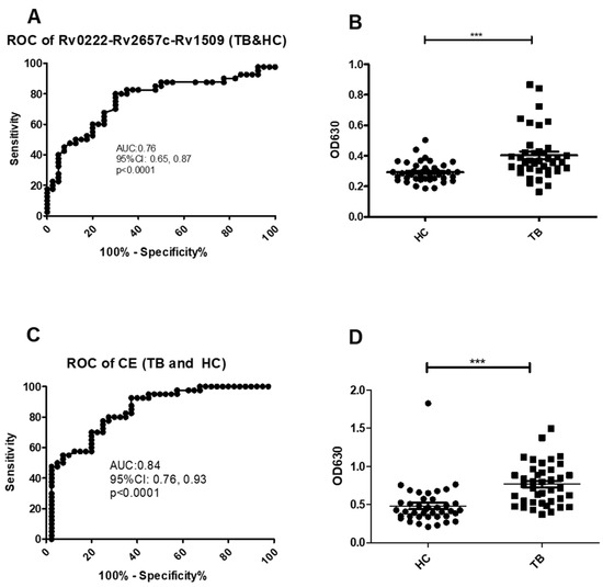 ROC and scatter plots for antibody detection using sera from TB and HC against Rv0222-Rv2657c-Rv1509 and CE. (A) ROC of Rv0222-Rv2657c-Rv1509 for TB and HC, (B) Rv0222-Rv2657c-Rv1509 antibody detection of TB and HC, (C) ROC of CE for TB and HC, (D) CE antibody detection of TB and HC. Symbol “***” presents p < 0.001.