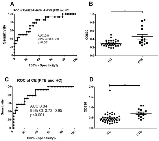 ROC and scatter plots for antibody detection using sera from PTB and HC against Rv0222-Rv2657c-Rv1509 and CE. (A) ROC of Rv0222-Rv2657c-Rv1509 for PTB and HC, (B) Rv0222-Rv2657c-Rv1509 antibody detection of PTB and HC, (C) ROC of CE for PTB and HC, (D) CE antibody detection of PTB and HC. Symbol “**” presents p < 0.01.