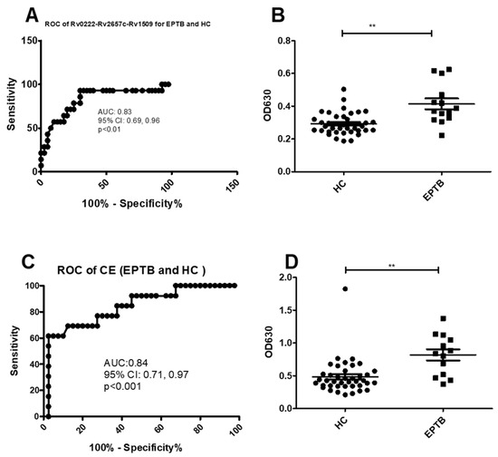 ROC and scatter plots for antibody detection using sera from EPTB and HC against Rv0222-Rv2657c-Rv1509 and CE. (A) ROC of Rv0222-Rv2657c-Rv1509 for EPTB and HC, (B) Rv0222-Rv2657c-Rv1509 antibody detection of EPTB and HC, (C) ROC of CE for ETB and HC, (D) CE antibody detection of PTB and HC. Symbol “**” presents p < 0.01.