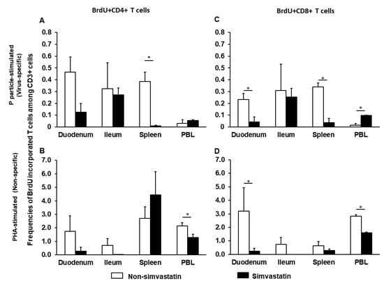 Virus-specific (A,C) and non-specific (B,D) proliferating T cells in the presence or absence of simvastatin. MNCs were stimulated with P particles or PHA and cultured with BrdU. Mean frequencies of CD3+CD4+BrdU+ and CD3+CD8+BrdU+ T cells in intestinal (duodenum, ileum) and systemic (spleen, PBL) tissues were analyzed by flow cytometry (Supplementary Figure S1). Note the difference in the Y axis scale between the upper (virus-specific) and lower (non-specific) panels. An asterisk above the bars indicates a significant difference between groups for the same cell type and tissue (p < 0.05 by Kruskal-Wallis rank-sum test).