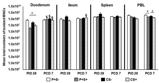 At PID 28, simvastatin feeding significantly reduced the total number of duodenal MNCs in vaccinated pigs (P+S− vs. P+S+) and also reduced the numbers in control pigs (CS− vs. CS+). Interestingly, CS+ pigs had significantly higher numbers of MNCs compared to P+S+ pigs in the duodenum. At PCD 7, simvastatin-fed pigs had significantly lower numbers of MNCs in PBL compared to non-simvastatin-fed pigs with or without vaccination. Total MNCs significantly increased in the duodenum of all groups post-challenge except P+S− pigs. Total MNCs also increased significantly in ileum of CS+ pigs post-challenge (Figure 2).