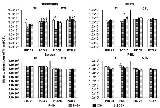 At PID 28, P+S+ pigs had significantly lower numbers of Th and CTLs in duodenum compared to P+S− pigs. Following NoV challenge, duodenal Th and CTLs increased significantly from PID 28 to PCD 7 in all groups except P+S− pigs. In duodenum, CS+ pigs had significantly lower numbers of CTLs compared to CS− pigs, but P+S+ pigs had significantly higher numbers of CTLs compared to P+S− and CS+ pigs. In ileum, CS+ pigs had significant increases in Th compared to prechallenge and significantly higher Th compared to P+S+ pigs. In PBL, P+S+ pigs had significantly higher Th numbers compared to P+S− pigs postchallenge (Figure 3). There were no significant differences in the numbers of splenic Th and CTLs among the treatment groups at either timepoints.