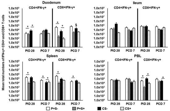 Post-challenge at PCD 7, P+S+ pigs had significantly lower numbers of CD4+IFN-γ+ and CD8+IFN-γ+ T cells in spleen compared to P+S− pigs. In fact, P+S+ pigs had no detectable CD4+IFN-γ+ and CD8+IFN-γ+ T cells in spleen post-challenge. Similarly, CS+ pigs had a complete lack of CD8+IFN-γ+ T cells in PBL, which were significantly lower than CS− pigs. Interestingly, CS+ pigs had significantly higher CD4+IFN-γ+ T cells in spleen compared to CS− pigs (Figure 7). Frequencies of the CD4+IFN-γ+ and CD8+IFN-γ+ T cells did not show any statistically significant difference among any treatment groups (data not shown).