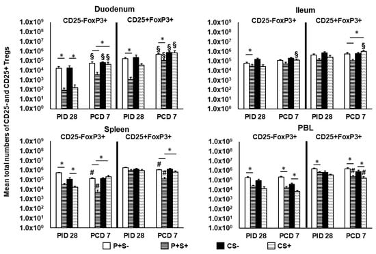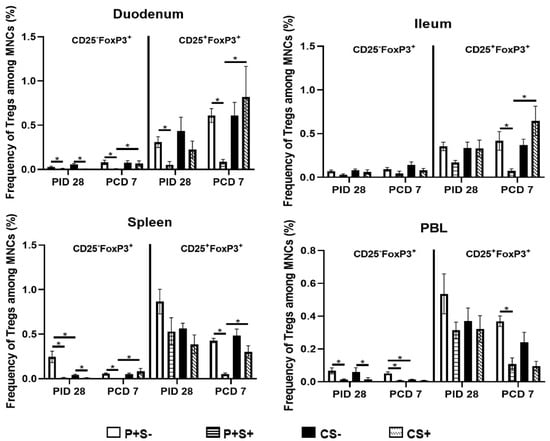 When comparing frequencies of CD25− and CD25+ Tregs among P particle-vaccinated or control pigs with or without simvastatin pre- and post-challenge (Figure 9), the overall trends and statistical significances are very similar to comparing the numbers of CD25− and CD25+ Tregs in all tissues, except that in the duodenum the frequencies, not numbers, of CD25+FoxP3+ Treg of CS+ pigs were significantly higher than the CS− pigs at PCD 7 (Figure 8 and Figure 9).