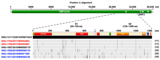 Schematic diagram of multiple alignments of the PEDV full S gene relative to the Korean prototype G2b strain KNU-141112 using Geneious software version 10.2.4. The top illustration represents the genomic regions, with green bars symbolizing the identified open reading frames (ORFs). Light gray arrows represent each 5′- and 3′-untranslated region. The second diagram displays the organization of the S protein, indicating the S1 and S2 domains that contain a signal peptide (SP), an N-terminal hypervariable domain (NTD), a fusion peptide (FP), heptad repeat regions (HR1 and HR2), and a transmembrane domain (TM). Red areas in the diagram depicting the S protein represent four neutralizing epitopes (NTD/SO, residues 19–220; COE, residues 502–641; residues 744–774; residues 1371–1377) of HP-G2b PEDV. The 2017–19 PEDV strains that were identified in our laboratory are color coded and include KNU-1704 and KNU-1708 (red) identified in December 2017 and KNU-1836, KNU-1904, and KNU-1911 (blue) identified in December 2018–March 2019. The KNU-1907 strain (black) identified in this study is marked with an asterisk (*). Lightly shaded areas are those identical to KNU-141112, and the vertical black bars represent one amino acid sequence that is divergent from that of KNU-141112. The strain name, isolation year, and GenBank accession number are shown on the left. The digits in parentheses on the right indicate the number of amino acid changes compared with KNU-141112.