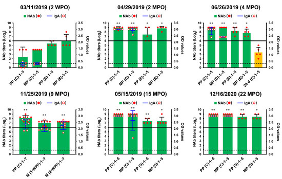 PEDV-specific antibody kinetics in serum (S) and colostrum (C) samples of the sows up to 22 months post-outbreak (MPO). The serum samples were collected from five primiparous (PP-1–5) and five multiparous (MP-1–5) sows or five 20-day-old piglets (20-d-1–5) at the indicated sampling times and subjected to a virus neutralization test (column chart; left y-axis). The colostrum samples from the sows (PP-1–5 and MP-1–5) at the indicated sampling times were subjected to a virus neutralization test (column chart; left y-axis) and the PEDV-S1 IgA ELISA (line chart; right y-axis). On 25 November 2019, the colostrum (C) and milk (M) samples were collected on and after one or two weeks postfarrowing (1- or 2-WPF) from seven primiparous sows and tested using ELISA. Neutralizing antibody (NAb) titers are presented on a log2 scale. The hypothetical protective NAb titer (1:64) against PEDV is indicated by a bold line. The samples above the OD cutoff value of 0.3 from the IgA ELISA (dashed line) were considered to be positive. The date of sample collection (month/day/year) is indicated at the top of each graph. Results are expressed as the mean NAb and IgA titers from the same pig group, and error bars represent the mean ± SDM. The results from each group on 11 March 2019, two weeks post-outbreak (2 WPO), before vaccination were compared with those from corresponding groups in the indicated sampling points after L/K/K vaccination. *, p < 0.05; **, p < 0.001.