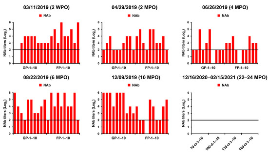 PEDV-specific antibody responses in serum samples of grow/finish pigs up to 24 months post-outbreak (MPO). The samples were collected from 10 growing pigs (GP-1–10; age, 70–100 days) and 10 finishing pigs (FP-1–5; age, 130–160 days) at the indicated sampling times and tested using a virus neutralization test. On 16 December 2020, 14 January 2021, and 15 February 2021, the samples were collected from 40 pigs at 70 days (n = 10; 70-d-1–10), 100-day (n = 10; 100-d-1–10), 130 days (n = 10; 130-d-1–10), and 160 days (n = 10; 160-d-1–10) of age and tested. Neutralizing antibody (NAb) titers of individual samples are presented on a log2 scale. The samples above the neutralizing endpoint titer 1:4 (dashed line) were considered to be positive. The date of sample collection (month/day/year) is indicated at the top of each graph.