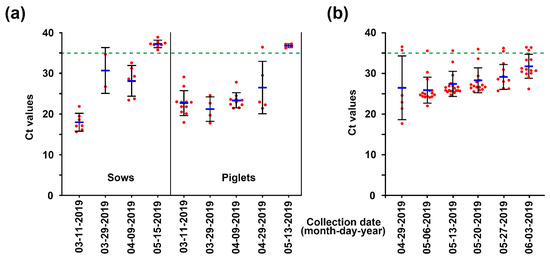 Initial monitoring of PEDV status in individual pigs or pen-level slurries from affected farrowing rooms using rRT-PCR. (a) Fecal shedding of PEDV in sows and piglets. The viral load in rectal swab samples collected from sows (left) or piglets (right) at the indicated sampling time point was determined using rRT-PCR analysis. (b) PEDV contamination in the farrowing rooms. The viral load in slurry samples collected from each farrowing house at the indicated sampling time point was determined using rRT-PCR analysis. The mean Ct values from all samples at each sampling time point are shown, and error bars denote the mean ± SDM. The samples below the mean Ct value cutoff value of 35 from rRT-PCR (green dashed line) were considered to be positive.