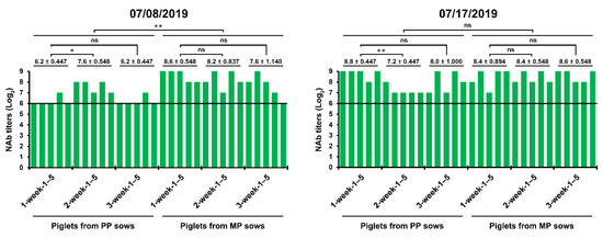 PEDV-specific antibody kinetics in serum samples of the suckling piglets. The samples were collected from 30 piglets 1 (n = 10), 2 (n = 10), and 3 (n = 10) weeks after birth from primiparous (PP) and multiparous (MP) sows at the indicated sampling times and tested using a virus neutralization test. Neutralizing antibody (NAb) titers of individual samples are presented on a log2 scale. The hypothetical protective NAb titer (1:64) against PEDV is indicated by a bold line. The date of sample collection (month/day/year) is indicated at the top of each graph. The mean NAb titers (±SDM) from the sample pig group are shown on a log2 scale. *, p < 0.05; **, p < 0.001; ns, not significant.