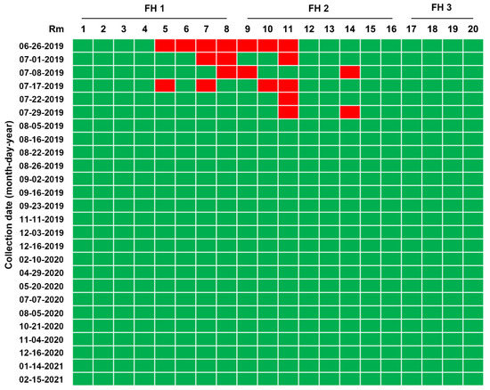 Longitudinal monitoring of PEDV status in pen-level slurry samples from 20 rooms (Rm 1–20) through 3 farrowing houses (FH 1–3) using rRT-PCR. PEDV detection in slurry samples collected from each farrowing barn at the indicated sampling times was determined using rRT-PCR analysis. The samples below the mean Ct value cutoff value of 35 from the rRT-PCR were considered positive. Rooms with PEDV-positive slurries are displayed in red, whereas rooms with PEDV-negative slurries are shown in green.