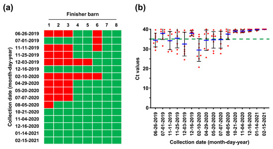Longitudinal monitoring of PEDV status in pen-level slurry samples from eight finisher barns (1–8) using rRT-PCR. (a) PEDV detection in the finisher barns. Pen-level slurry samples were collected from each finisher barn at the indicated sampling times, and PEDV contamination was determined using rRT-PCR analysis. Barns with PEDV-positive slurries are displayed in red, whereas barns with PEDV-negative slurries are shown in green. (b) Viral load in the slurry samples collected from the finisher barns. The mean Ct values from all samples at each sampling time point are shown, and error bars denote the mean ± SDM. The samples below the mean Ct value cutoff value of 35 from rRT-PCR (green dashed line) were considered to be positive.