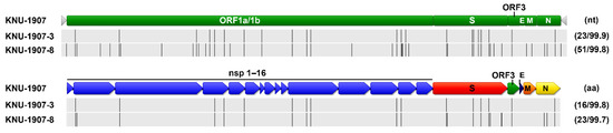 Schematic diagram of the genomic differences among PEDV strains at the nucleotide (nt, top) and amino acid (aa, bottom) levels. The top illustration represents the genomic regions, with green bars symbolizing the identified ORFs. Light gray arrows represent each 5′- and 3′-untranslated region. The second diagram represents the genomic regions, with blue and various arrows indicating the nonstructural (nsp1–16) and structural (S-ORF3-E-M-N) proteins, respectively. Lightly shaded areas are those identical to KNU-1907, and the vertical black bars represent one nucleotide (nt) or amino acid (aa) sequence that is divergent from that of KNU-1907. The digits in parentheses on the right indicate the number of nt or aa changes and the percent identity compared with KNU-1907.