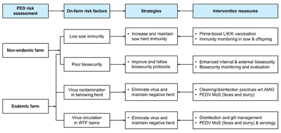 Customized disease control strategies and measures upon PEDV exposure. Once PEDV is introduced into a swine herd, a risk assessment of PED recurrence is conducted to identify on-farm risk factors that should be managed to control PED and prevent re-exposure in the affected farm. The main factors influencing PED recurrence in farrow-to-finish (FTF) farms can be divided into four different categories: low sow immunity, poor biosecurity, virus contamination in farrowing houses, and virus circulation in wean-to-finish (WTF) barns. The four-pillar-based coordinated intervention strategies for disease control are utilized to stimulate the immunity or/and eliminate the virus for eradication in the FTF herd.