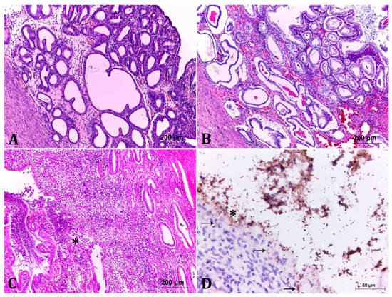 Histological analysis of the degrees of endometrial lesions in cases of pyometra. (A) Mild lesion. There is discrete hyperplasia of endometrial glands, with occasional ectasia. In addition, there are foci of discrete inflammatory infiltrate in the interstices of the glands. HE, 10×. (B) Moderate lesion. It shows more pronounced hyperplastic and ectatic lesions when compared to Figure 1A, associated to moderate interstitial inflammatory infiltrate of lymphocytes, plasma cells, macrophages and neutrophils. The endometrial and glandular epithelium are vacuolated and occasionally contain several layers. Some glands are filled with basophilic or amorphous eosinophilic material. HE, 10×. (C) Severe lesion. There is marked mixed inflammatory infiltrate (lymphocytes, plasma cells, macrophages and neutrophils) associated with marked endometrial gland necrosis (asterisk). Some glands are lumen filled with cellular debris and the remaining epithelium is vacuolated and often infiltrated by inflammatory cells. HE, 10×. (D) Anti-E. coli immunohistochemistry of the strain LBV_029/18. Accentuated and diffuse immunostaining of multiple coccobacilli adhered to the lining epithelium and in the medium to the content in the uterine lumen. Note that there are often bacteria inside the epithelial cells (arrow) and in the interstice of the endometrium (arrow) illustrating the invasive profile, 40×.