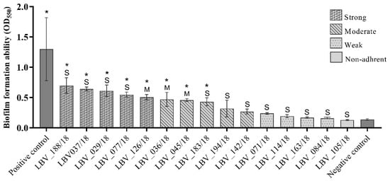 Biofilm formation ability of the E. coli strains from pet pyometra. Each column represents the mean of optical density at 550 nm (OD550) of the respective E. coli strain. The column design represents the biofilm formation ability classified as strong, moderate, weak and non-adherent. The “S” symbolizes strains isolated from uterus histopathology classified as severe pyometra degree. The “M” symbolizes strains isolated from uterus histopathology classified as moderate pyometra degree. *: statistically significant compared to negative control at one-way ANOVA test. Staphylococcus epidermidis ATCC 35984 was used as positive control. Wells contained only broth were used as negative control.
