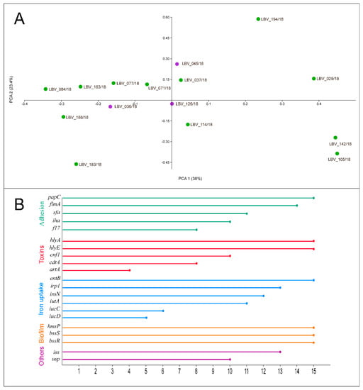 (A) 2D Principal Coordinate Analysis (PCoA) visualization of E. coli strains from pet pyometra. Data were computed from the Dice’s distance matrix with the virulence determinants. Strains are coloured based on their endometrial histopathology lesion classification: purple: moderate lesion; green: severe lesion. (B) Frequency of virulence genes identified by PCR assay in the E. coli strains. Each line represents the frequency that the respective virulence gene was detected by PCR method in the 15 E. coli strains of this study. The genes were grouped and coloured based on E. coli virulence factor classification, related to adhesion, toxicity, iron uptake systems, biofilm formation, and others (bacteriocin—usp; invasion—iss).