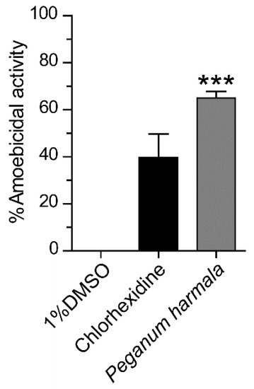 Peganum harmala seed extract was prepared at a final concentration of 1 mg/mL and tested for an anti-Acanthamoeba activity against A. triangularis trophozoites. The percentage of cidal activity was approximately 65%, and the statistical analysis data showed that it significantly killed the Acanthamoeba trophozoite compared to 1% DMSO control (Figure 1).