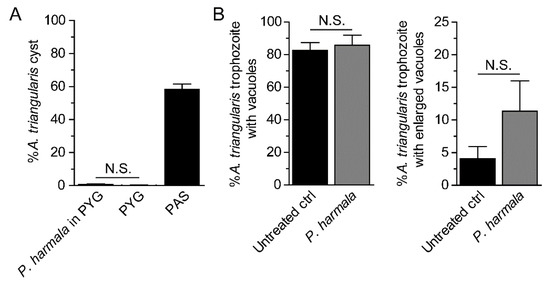 Analysis of cyst formation and vacuolization on surviving trophozoites. The surviving trophozoites were further analyzed for cyst formation and vacuolization after treatment with the P. harmala extract at a concentration of 225 µg/mL. (A) The percentage of cysts under the extract treatment. Trophozoites cultured in PYG and PAS media alone were included as negative and positive controls for encystation, respectively. (B) Surviving trophozoites of at least 100 cells per condition were examined for vacuole formation. Percentages of trophozoites containing vacuoles (left) and trophozoites with enlarged vacuole (diameter ≥ 5 µm) (right) were analyzed. The data were obtained from 3 independent experiments. Bar graphs show mean ± SD. N.S., not significant.