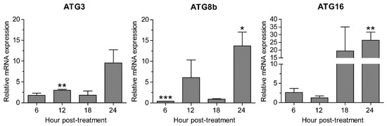 Transcriptional expression of autophagy-related genes. A. triangularis trophozoites were cultured in PYG medium in the presence or absence of the extract and incubated for 24 h. The relative changes in mRNA levels of the ATG3, ATG8b, and ATG16 genes were examined every 6 h using quantitative PCR. The level of indicated transcripts from each time point was expressed as a relative mRNA expression. 18S rRNA was used as an internal normalization gene. The expression level was compared to that of time zero, defined as 1. The data were obtained from 3 independent experiments. Bar graphs show mean ± SEM. * p < 0.05; ** p < 0.01; *** p < 0.001.