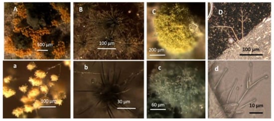 Stereomicrographs of major fungi colonizing moist cork liner. (A,a) Aspergillus-like conidiophores; (B,b) ascomata characteristic for Chaetomium-like fungi; (C,c) mycoparasitic Trichoderma-like colonies; and (D,d) a dominant colonizer, a fungus with straight erect repeatedly branched orange conidiophores, 100 × 4–4.5 μm.
