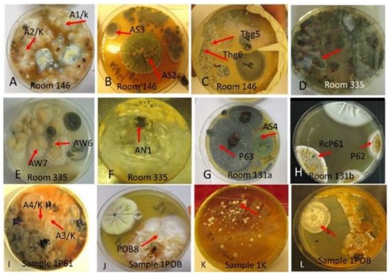 Pieces of moist cork liner and mineral wool cultivated on malt extract agar for 14 d at 22 °C. (A–C,G,H); dominant colonies from cork liner (samples 1P61,1POB,1K). (D–F) Major colonies from mineral wool (sample 3MW). Origin of isolates characterized/identified are marked with red arrows and representative strain codes. (K) Colonies of white, spore-forming actinobacteria; (L) unidentified toxigenic and antagonistic fungicidic colony type appearing on this plate only.