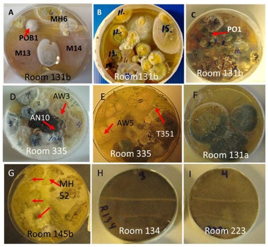 Settled dust collected from six rooms cultivated on MEA for 14 d. Origin of characterized/identified isolates are marked with red arrows and representative strain codes. (A–G) Major fungal colonies from dust collected from problematic rooms. (H,I) Dust cultivated from nonproblematic rooms in ordinary use.