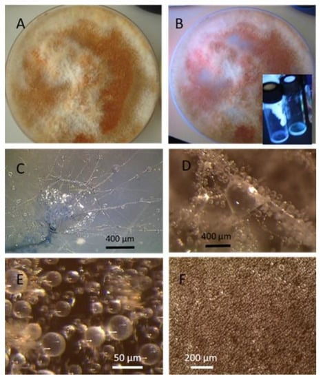 Acrostalagmus luteoalbus strain POB8 cultivated on malt extract agar for 10 d. (A) Pure-cultured strain in visible light. (B) Same plate exhibiting blue fluorescing exudates when excited with UV light (insert). (C–F) Stereomicroscopic views of plate in (A): (C,D) Exudates emitted from fungal hyphae. (E,F) Liberated vesicles.