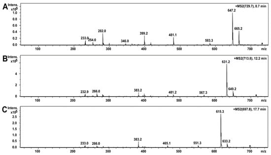 MS/MS spectra of compounds of A. luteoalbus POB8 ethanol extract: (A) compound 1 precursor ion m/z at 729.7; (B) compound 2 precursor ion m/z at 713.8; (C) compound 3 precursor ion m/z at 697.8.