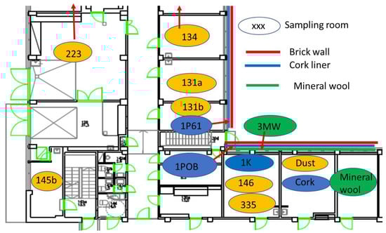 A public building in southern Finland that was involved in indoor-air-related complaints was investigated for mold contamination during 2013–2014, as described in [73]. The building consisted of two parts: an old wing built in 1957 (rooms 145b, 146, and 335) and a new wing erected in 1963 (rooms 131a, 131b, 223, and 134); it was concrete-framed and brick-lined and had mineral wool as isolation material. The building still contained the original construction materials, such as a cork liner in the building network (Figure 7 and Figure 8), and mechanical ventilation was installed in the 1970s. Ventilation was turned off from 8:00 pm to 6:00 am on workdays and during weekends. The floor plan of the building, the sites of the investigated rooms, and the structure of the outer wall are shown in Figure 1. The building underwent an indoor air survey in 2010 and problematic rooms were abandoned. Reported symptoms included respiratory distress, increased oxygen demand, the need for a portable oxygen cylinder, and skin symptoms (personal communication from the occupants).