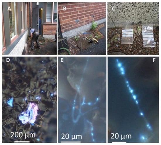 Sampling of building materials from water-damaged outdoor wall (upper panels), and micrographs of obtained samples (lower panels). Upper panels show (A) drilling of holes in plinth of outer wall; (B) used tools; and (C) obtained samples of wet cork liners stored in plastic bags. Lower panels show pieces of sampled wet cork liner with Hoechst 33342 nucleic acid stain + propidium iodide staining microbial structures containing DNA or RNA blue and red. (D) Degraded surface contaminated with microbes. (E,F) Growing actinobacterium and growing fungal hyphae.