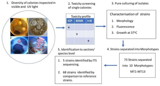 Scheme illustrating experimental design for tracking diversity of major microbial constituents in building materials and dust. After three weeks of incubation, colonies on primary isolation plates (not yet single-spored) were numbered and screened for toxicity. Toxic colonies were streaked pure, characterized, and separated into morphotypes. Representatives of morphotypes were identified by ITS sequencing or by comparison with reference strains according to [106].