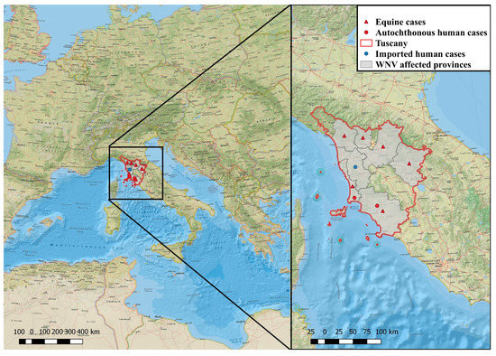 - Autorino, G.L.; Battisti, A.; Deubel, V.; Ferrari, G.; Forletta, R.; Giovannini, A.; Lelli, R.; Murri, S.; Scicluna, M.T. West Nile virus Epidemic in Horses, Tuscany Region, Italy. Emerg. Infect. Dis. 2002, 8, 1372–1378. [Google Scholar] [CrossRef]