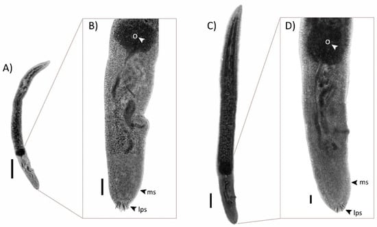 Light microscopy photographs of Paradeontacylix sp. from Seriola lalandi on the Chilean coast. (A) Ventral view of complete body of Paradeontacylix humboldti n. sp. and (B) details of posterior region. (C) Ventral view of complete body of Paradeontacylix olivai n. sp. and (D) details of posterior region. Abbreviations: lps, large posterior spines; ms, marginal spines; o, ovary. Scale bars: (A,C), 250 μm; (B,D), 50 μm.