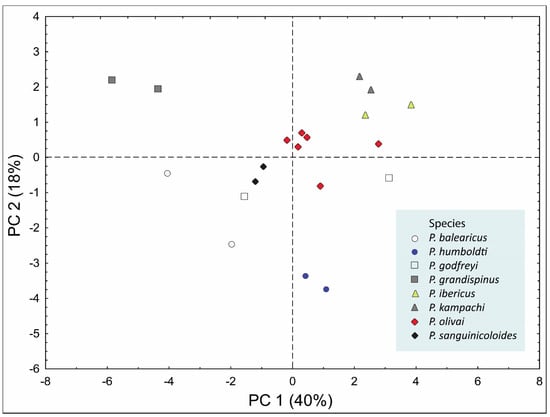 To evaluate differences in morphometry among the fluke species, a principal component analysis (PCA) was performed using proportional body measurements as all relevant fluke measurements are correlated with body length []. For this analysis, the following 16 body measurements divided by total body length (BL) were used: maximum body width, number of marginal tegumental spine rows, posterior spine length, esophagus length, anterior caeca–intestine distance, posterior caeca–intestine distance, number of testes, testicular area length, male genital pore–posterior end distance, ovary length, ovary width, oviducal seminal receptacle length, oviducal seminal receptacle width, oötype length, oötype width, and female genital pore–posterior end distance. These analyses were performed using the Statistica 7.0 software (StatSoft Inc., Tulsa, OK, USA).