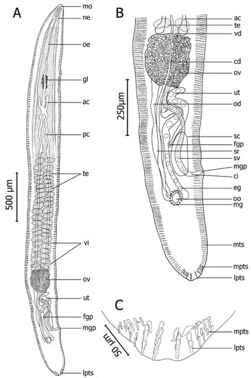Ovary shield-shaped, distally elongated, posterior to testes, ventral to vas deferens, 778–1100 (911, n = 8) from its posterior end to posterior end of body, corresponding to 21–23% (22%, n = 8) of body length (Figure 5B). Oviduct originating at dextral posterior end part of ovary. Posterior part of oviduct expanding to form oviducal seminal receptacle (Figure 5B). Oviducal seminal receptacle narrowing progressively and joining common vitelline duct before forming oötype (Figure 5B). Oötype in mid-line, 330–443 (361, n = 6) from posterior end of body, surrounded by Mehlis’ gland (Figure 5B). Vitelline duct passing posteriorly, sinistral to oviduct. Uterus occupying zone from posterior end of ovary to oötype, sinistral to common vitelline duct, after ascending through several coils (filling space immediately posterior to ovary) and then descending to female genital pore (Figure 5B). Female genital pore dorsal, opening in midline, antero-dextral to male genital pore, 102–174 (143, n = 5) from sinistral body margin, 167–204 (190, n = 5) from male genital pore, 616–753 (664, n = 5) from posterior end of body. Eggs intrauterine, ellipsoidal (Figure 5B). Excretory vesicle and pore not observed. Vitellarium extending from level at or near nerve commissure to level of posterior end of ovary (Figure 5A).