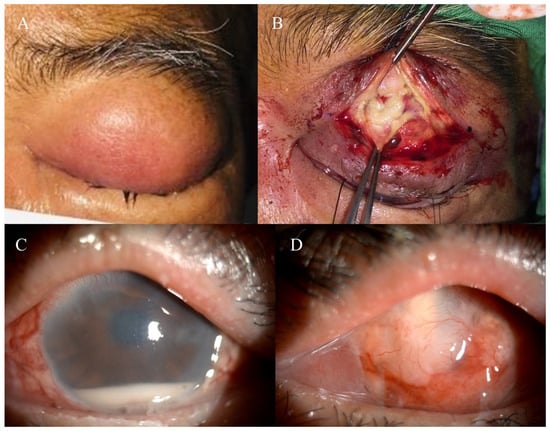 (A) The patient had periorbital pain and eyelid erythematous swelling for two days. (B) Whitish necrotic tissue in the upper palpebral conjunctiva, tarsus, Müller’s muscle and levator muscle was observed during surgery. (C) Slit lamp biomicroscopy revealed that the left eye injected the conjunctiva and hypopyon 3 mm in height. (D) After four months of follow-up, he developed phthisis bulbi.