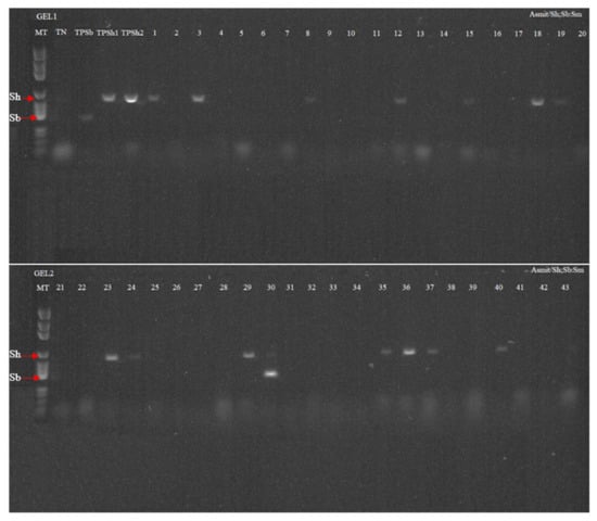 Positive samples obtained from Dra 1 real-time PCR, were tested by a discriminative multiplex PCR targeting S. haematobium, S. bovis, and S. mattheei. This PCR technique employed markers of different lengths in mitochondrial sub-unit 1 of the cytochrome c oxidase 1 (COX1) gene [28]. Amplification was achieved in a reaction volume of 25 μl including 2 μL of extracted snails DNA and 23 μl of Master Mix AmpliTaq Gold® 360 PCR (Applied Biosystems™, Waltham, MA., USA). The concentrations of RD-PCR primer in the reaction were 0.2 μM of direct universal primer Asmit1 (TTTTTTGGTCATCCTGAGGTGTAT) and 0.2 μM of each reverse primer (Sh. R:5′-TGATAATCAATGACCCTGCAATAA-3′, Sb.R: 5′-CACAGGATCAGACAAACGAGTACC-3′ and Smat.R: 5′-CACCAGTTACACCACCAACAGA-3′, respectively [18,28]. The amplification protocol was carried out with initial denaturation at 95 °C for 15 min, with 39 cycles at 95 °C for 30 s, at 58 °C for 1 min, 72 °C for 1min and a final stage at 72 °C for 7 min using a Thermal Cycler (Applied Biosystems, Foster City, CA, USA). The migration was carried out for 1 h and 15 min to 180V in a 1.5% agarose gel with an SYBR safe dye and the reading was using a Gel Doc System (Bio-Rad, Hercules, CA, USA) (Figure 2).