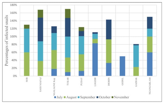 The snail infestation rates were 27.61%, 37.09%, and 18.41% at the beginning, middle, and end of the rainy season, respectively. There were a significant difference between the snail infestations seen at the beginning, the middle, and the end of the season (χ2= 27.816, df = 2, p = 9.118 × 10−7). The infestation levels in villages were different according to the period of the rainy season. In some villages including Ngalagne Kop, Puday, and Diohin, transmission occurred at beginning of the rainy, reached a peak in the middle, and declined by the end of the rainy season. In Sob and Gadiak villages, the peak was noticed in the middle of the rainy season, with no snail infested at the beginning of the rainfall in July. At the same time, the peaks of infestation were observed in Logdir and Ngangarlam. In Logdir, the level of snail infestation (83.3%) found in July was the highest observed in the study site but dropped considerably in the middle and the end of the rainy season. In Ngangarlam B. umbilicatus and B. senegalensis were present in snails at the beginning and the middle of the season but, only B. senegalensis was present at the end of the season. In Godel, a snail infestation was only observed at the beginning of the rainy season. In Sass njafaj, the snail infestations occurred in the middle and at the end of the rainy season (Table 2) (Figure 3). Overall, in the majority of villages, snail infestations were observed very early in July; however, the infestation peaks occurred in the middle of the rainy season (Figure 3). The infestation rate was higher (33.47%) in the northern villages (Gadiak, Ngalagne Kop, Tukar, and Puday) compared to the proportion of the 25.74% observed in the southern villages (Godel, Logdir, Sass njafaj, Sob, and Diohin).