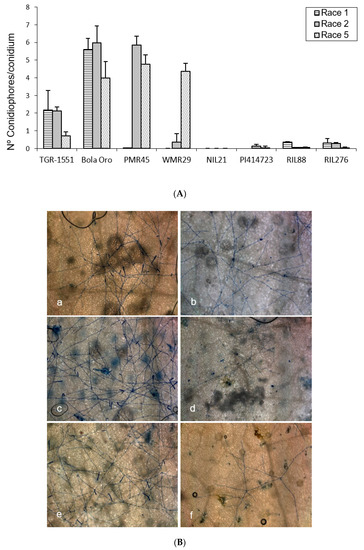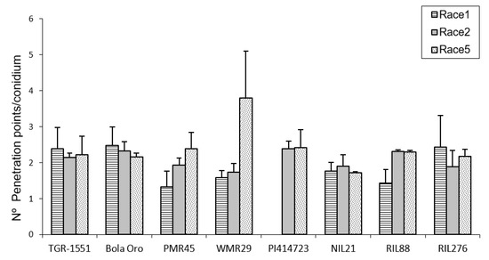 In order to observe the fungus development, the number of mature conidiophores was counted in the different melon accessions grown at TUM at 22 °C, 70% RH, and 16/8 light/dark (Figure 1). The highest number of mature conidiophores, more than four per conidium, was detected for “Bola de Oro” inoculated with races 1, 2, and 5, “PMR 45” inoculated with races 2 and 5, and “WMR 29” with race 5 (Figure 1). In all these cases, the response to powdery mildew was susceptible (compatible interaction). The lowest values, approximately one or none conidiophore per conidium, were identified in cases of resistant response (incompatible interaction), concretely in “PI 414723” for races 2 and 5, NIL21, RIL88, and RIL276 for races 1, 2, and 5, in “PMR 45” for race 1, and in “WMR 29” for races 1 and 2. The resistant melon line “TGR-1551” showed, however, intermediate scores for the three races (Figure 1).